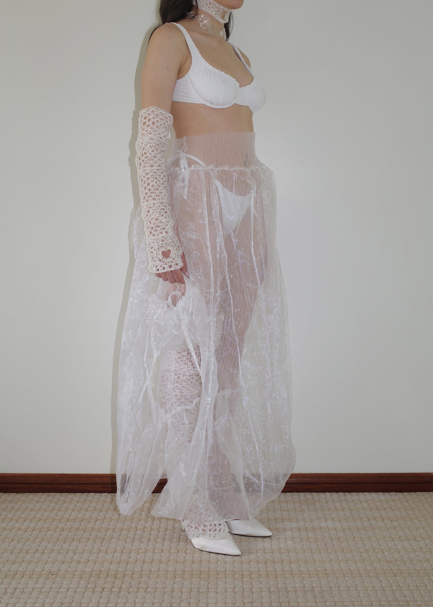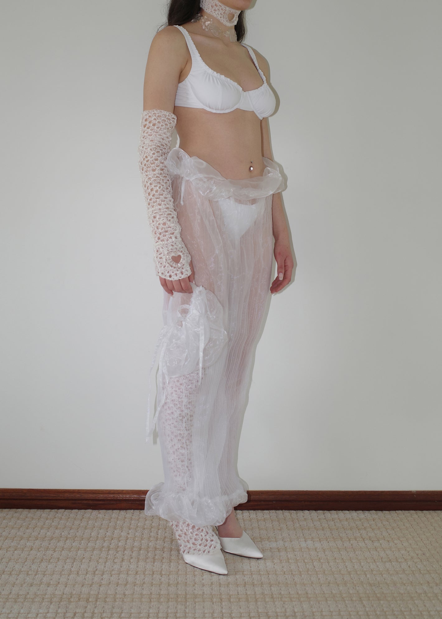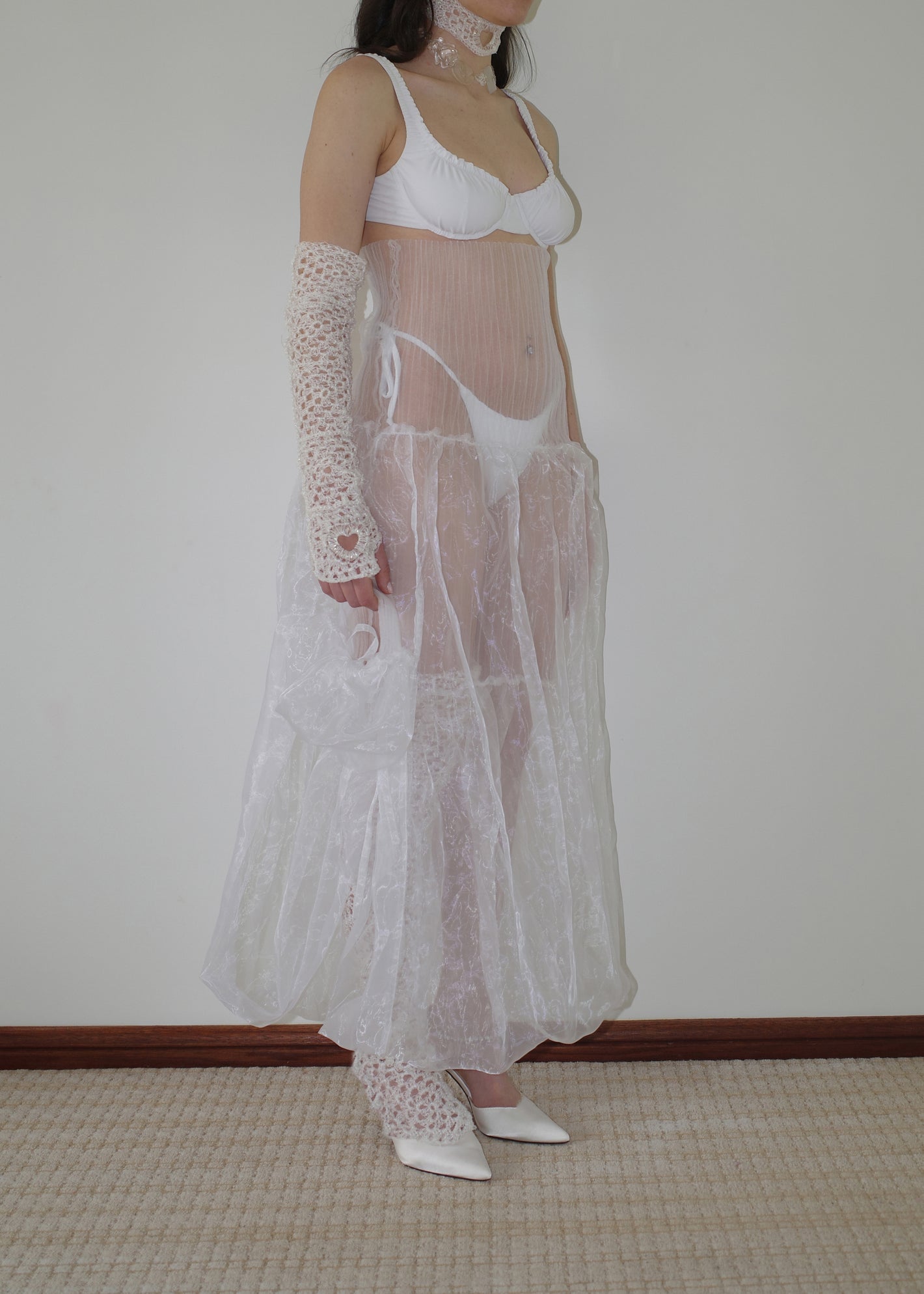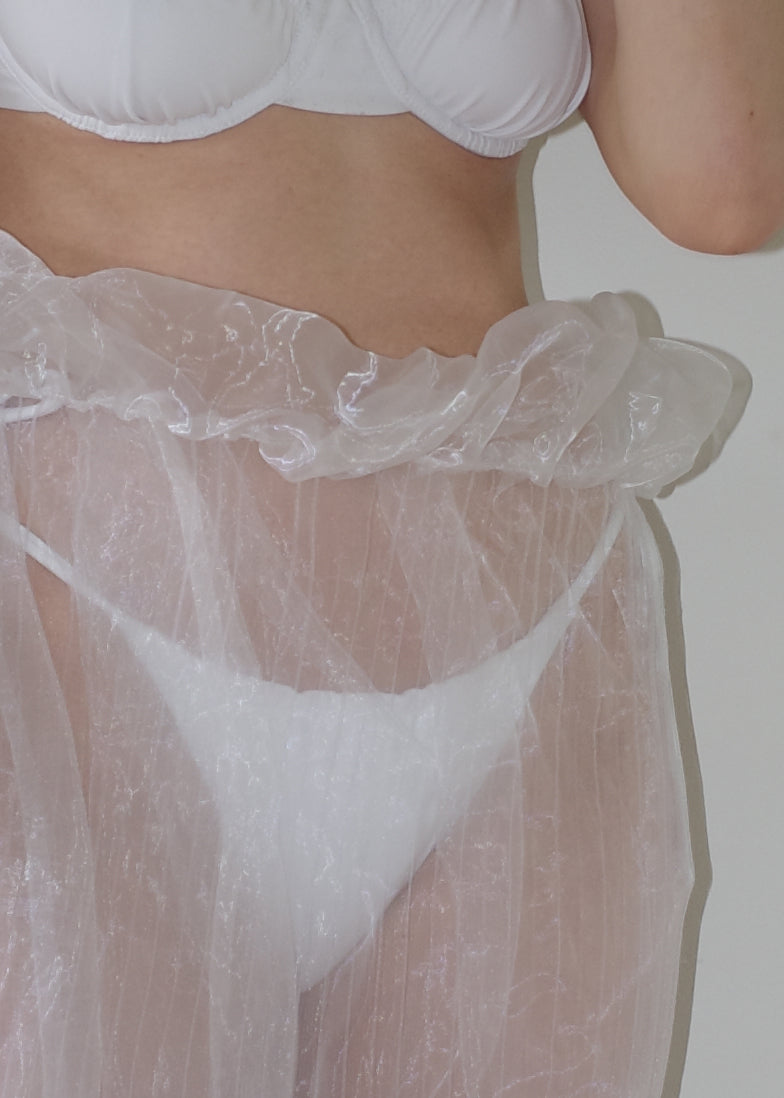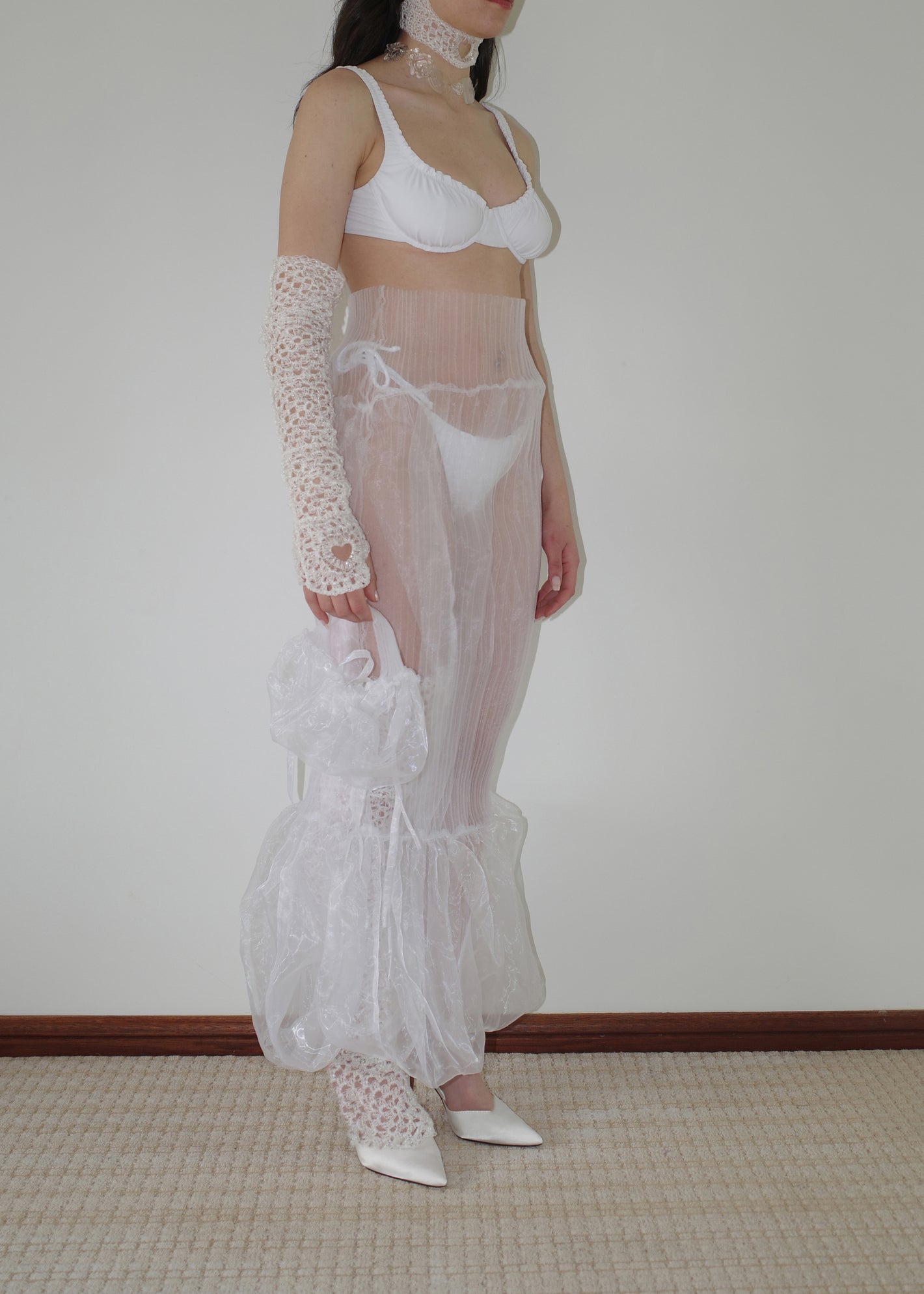 A MULTI-FUNCTIONAL, CONTOURING TUBE THAT CAN BE WORN IN 6 DIFFERENT WAYS. FEATURING A TECHNICAL RIB-KNIT SHELL AND DRAMATIC RUCHED ORGANZA LINING MADE WITH TRANSPARENT FIBRES AS FINE AS HAIR.