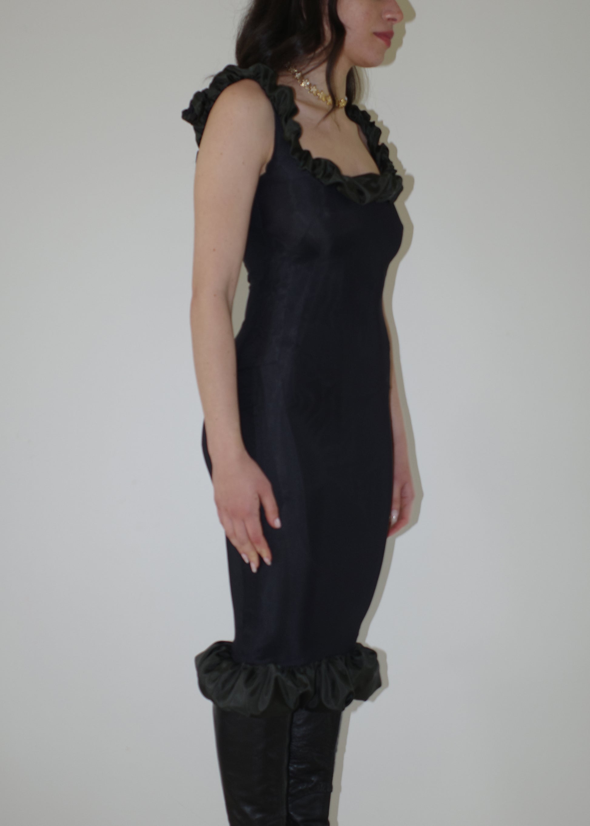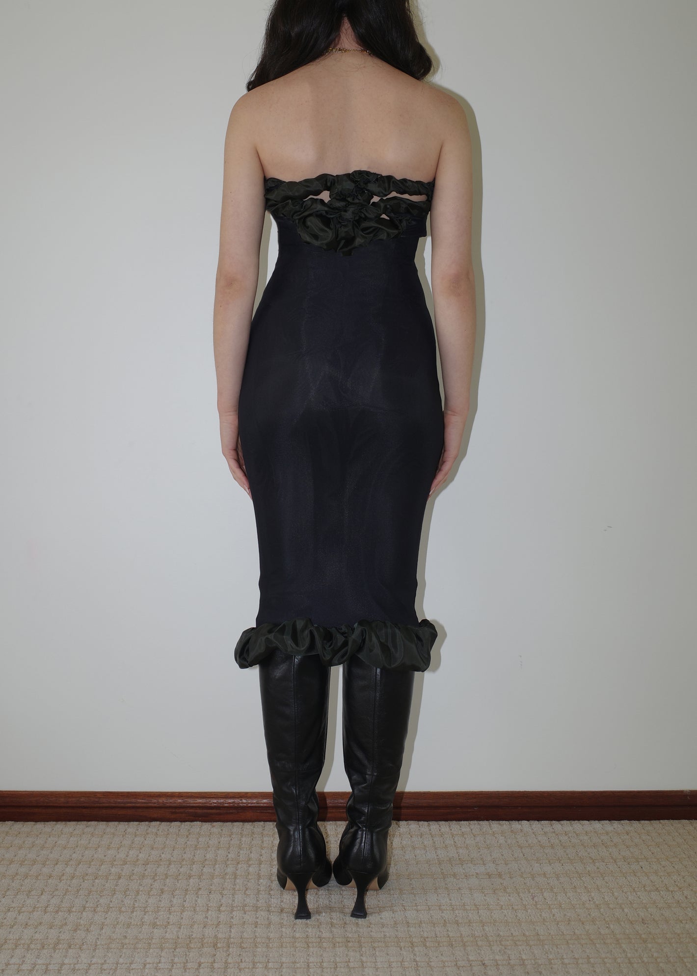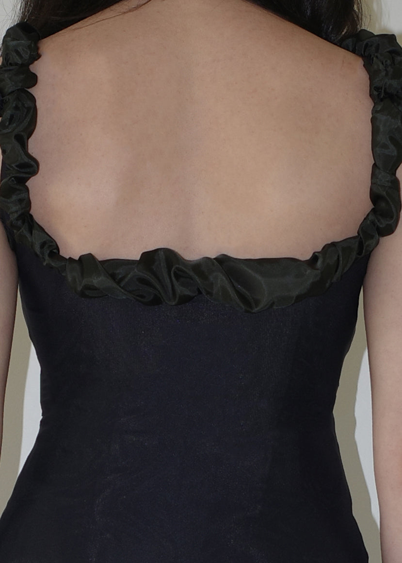 002 CONTOURS THE BODY WITH TECHNICAL ITALIAN JERSEY THAT STRETCHES AND CONTRACTS FOR EXTREME COMFORT AND SIZE FLEXIBILITY. DRAMATIC RUCHED BEMBERG LINING ON THE NECKLINE & HEM FRAMES THE BUST AND CURVES OF THE BODY.