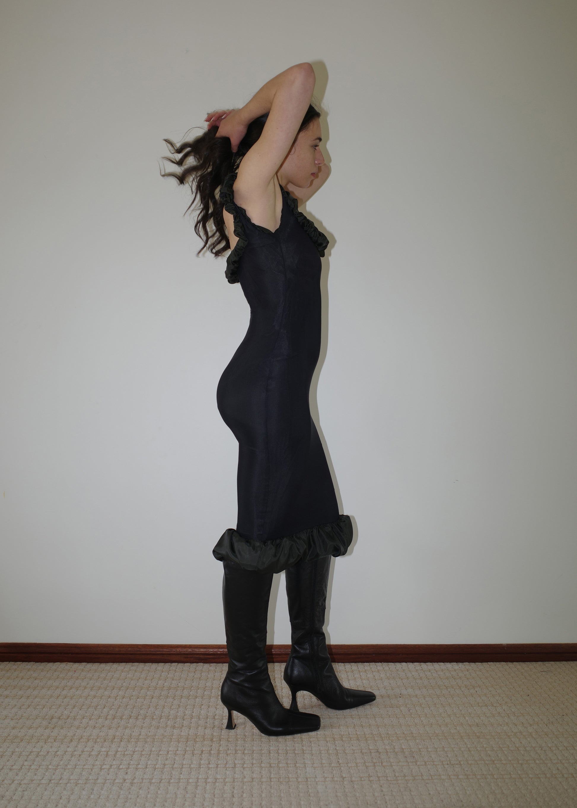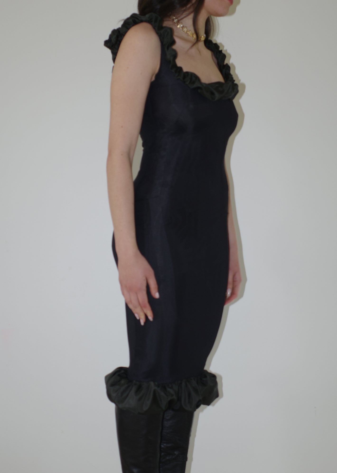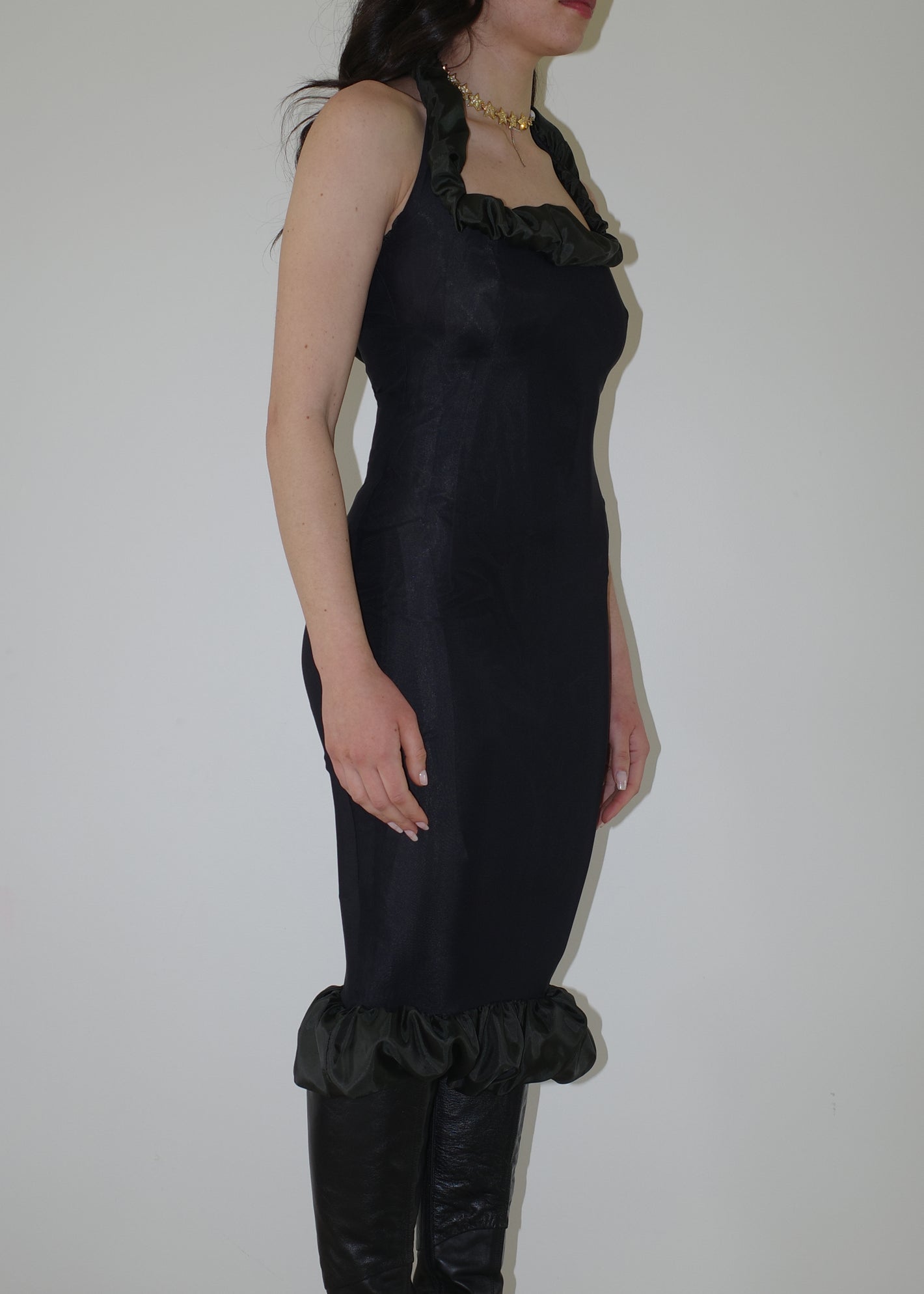 002 CONTOURS THE BODY WITH TECHNICAL ITALIAN JERSEY THAT STRETCHES AND CONTRACTS FOR EXTREME COMFORT AND SIZE FLEXIBILITY. DRAMATIC RUCHED BEMBERG LINING ON THE NECKLINE & HEM FRAMES THE BUST AND CURVES OF THE BODY.